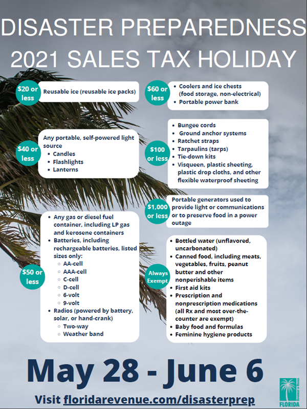 For more information about the Disaster Preparedness Sales Tax Holiday, visit FloridaRevenue.com/disasterprep